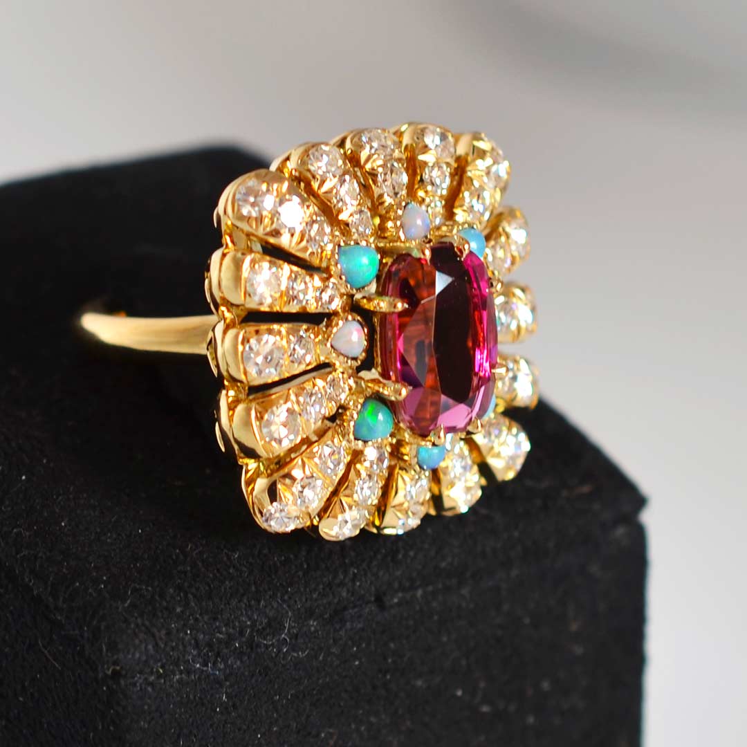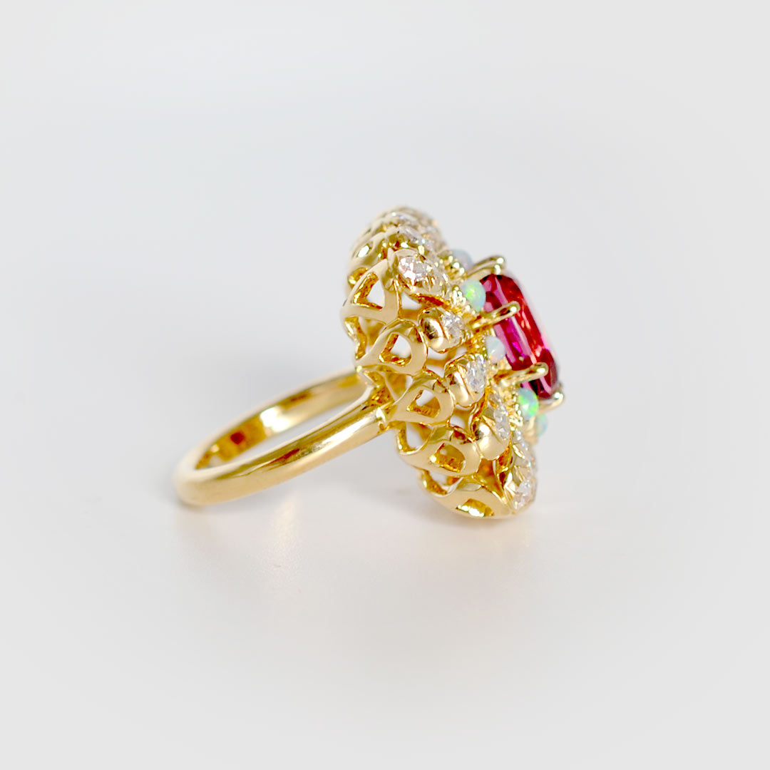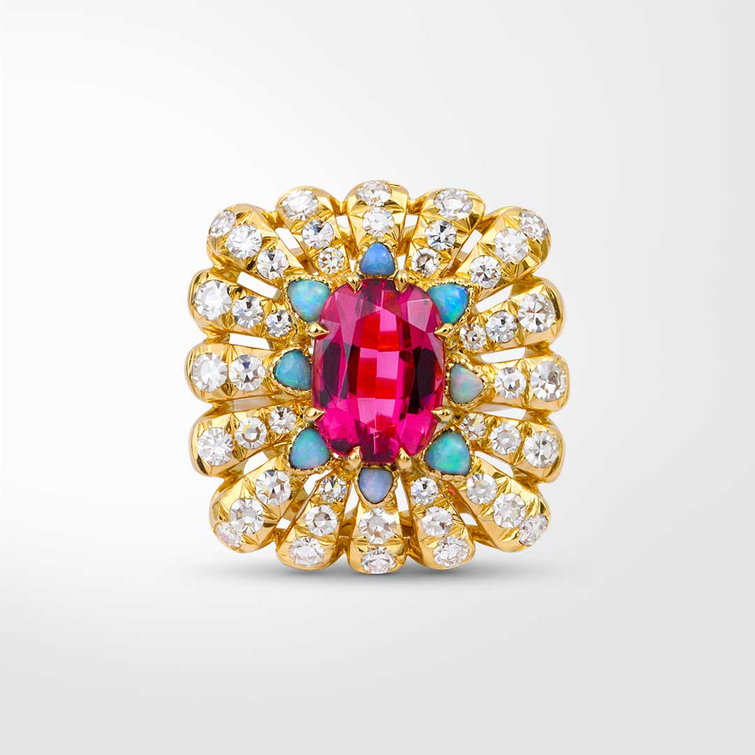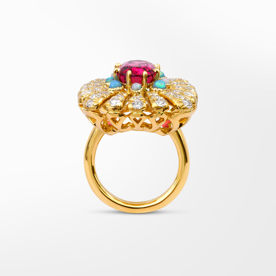 Elle évoque les trésors de la nature à travers les rayons solaires d’or sertis de diamants au centre une rubellite.
